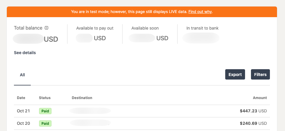 Note: Some components within StellarPay will still display live data even while StellarPay is in Test Mode. This is because of limitations with the Stripe API. If live data is displayed, a notice will appear above the content.