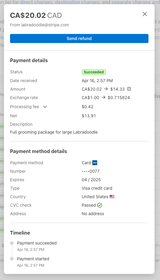 On the Payments page, you will see a list of all payments processed through your LIVE Stripe account. To find the payment associated with the WooCommerce order that you would like to refund: