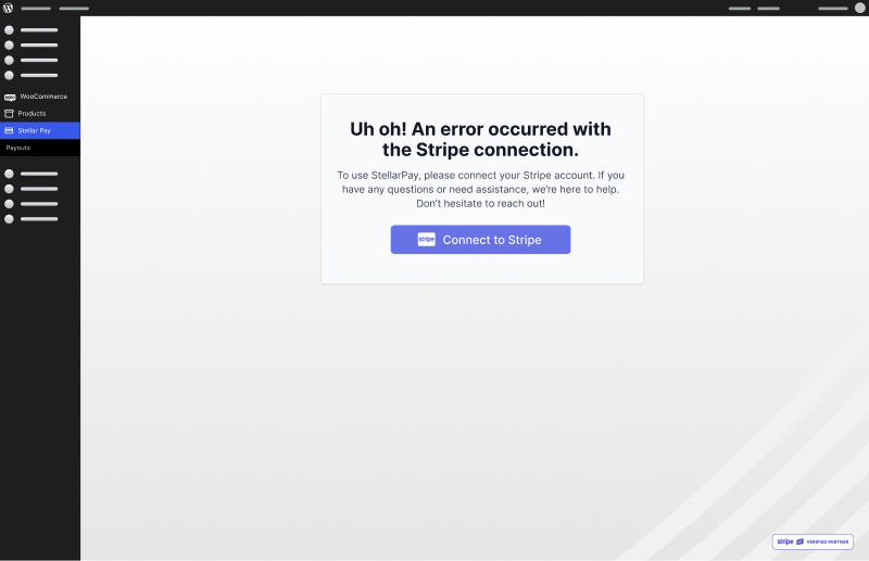 2. Connect to Stripe: After activation, click the “Connect to Stripe” button. You’ll be directed to a secure portal where you can log in to your Stripe account. This connection allows StellarPay to handle transactions directly through your Stripe account, ensuring that payments are processed securely and efficiently.